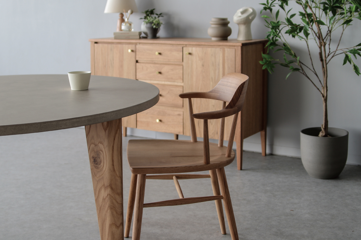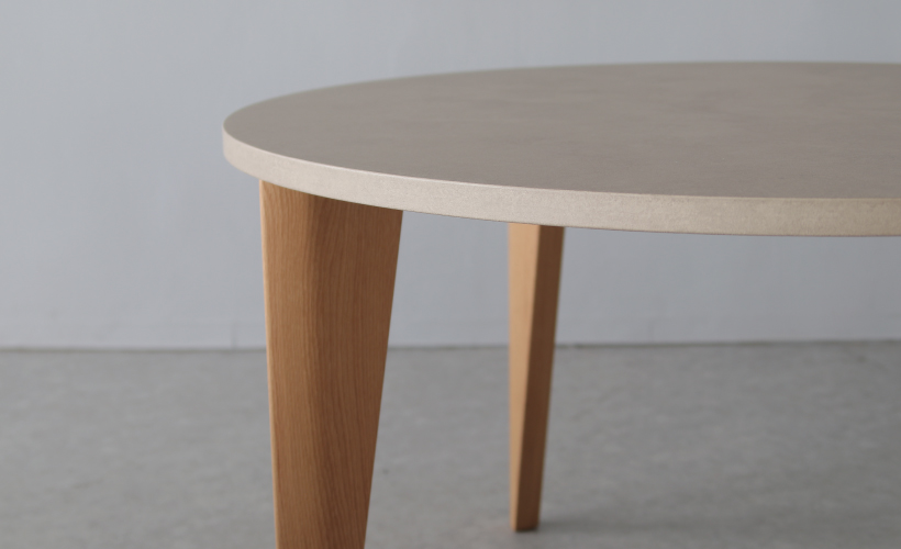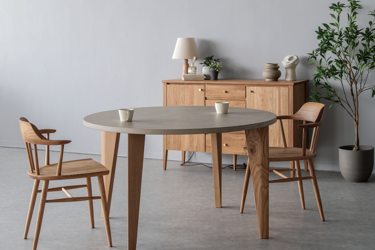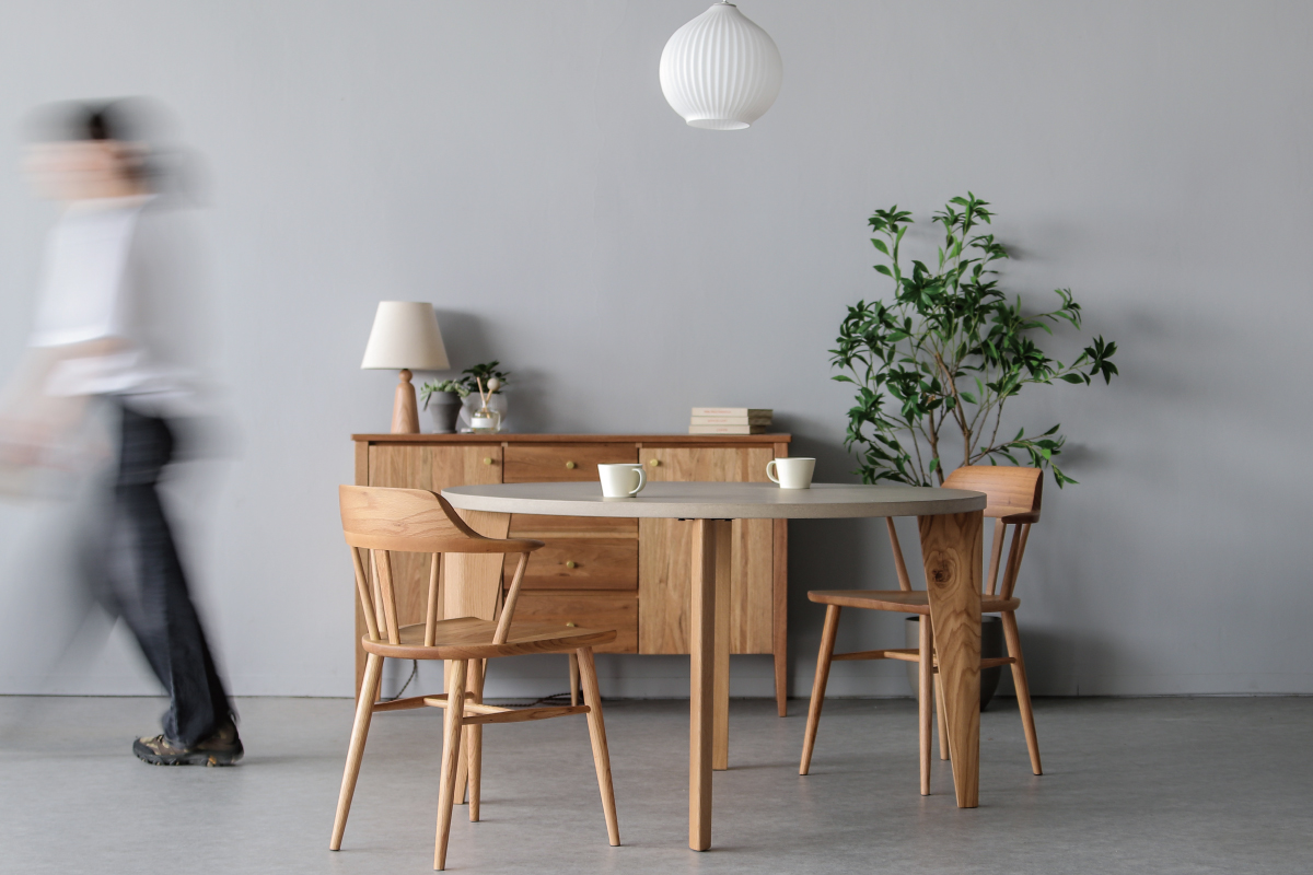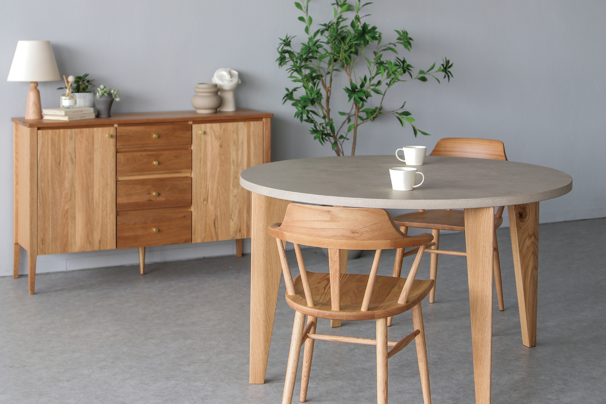 モルタル調の天板が特徴的なラウンド型のダイニングテーブル。