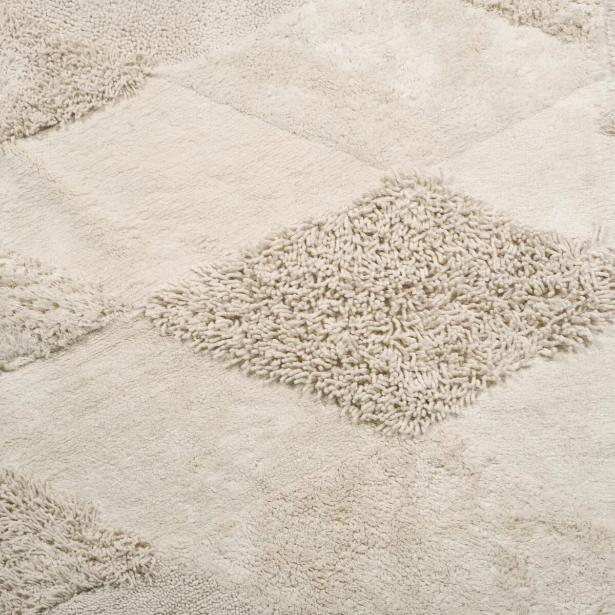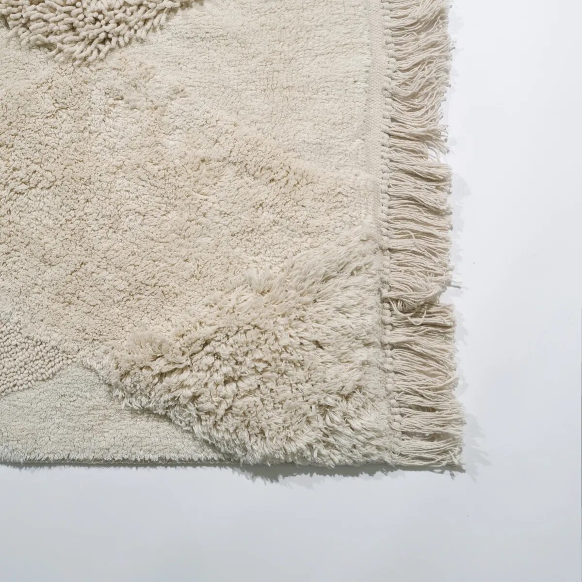 全て手作業で作られた商品のため、1点ごとに風合いが異なります。また、機械生産品と比べて遊び毛が出やすくなっております。こまめに掃除機がけを行ってください。