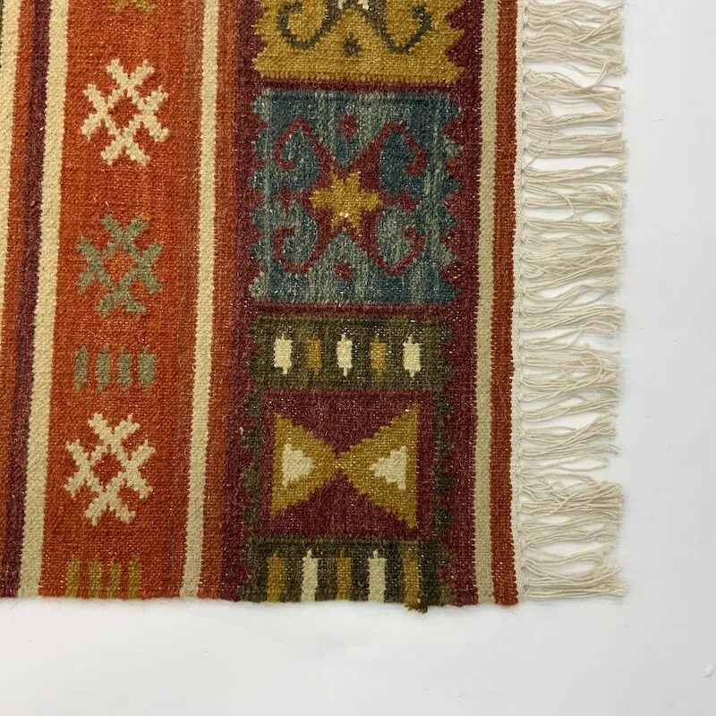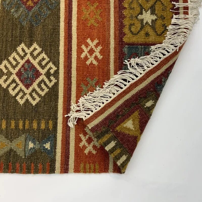 独特な幾何学模様とカラフルな色使いが印象的なウールキリムラグ。