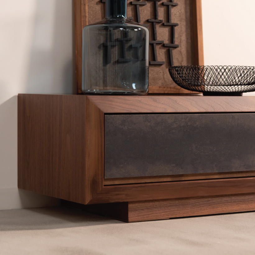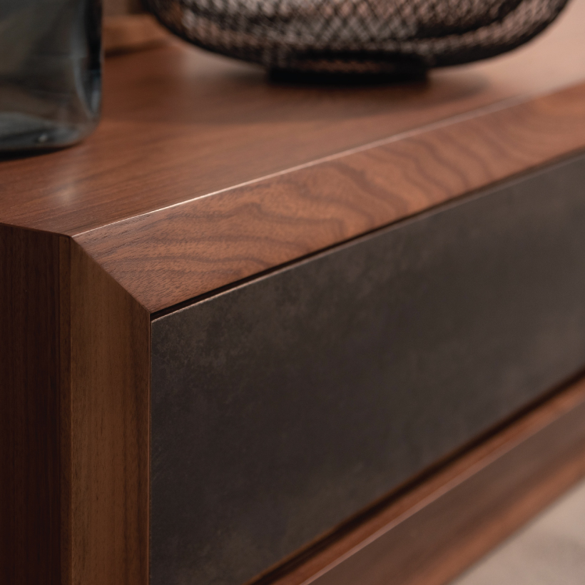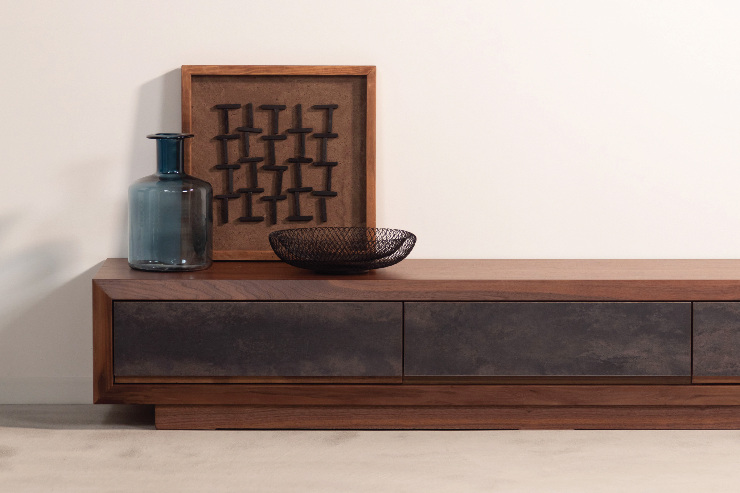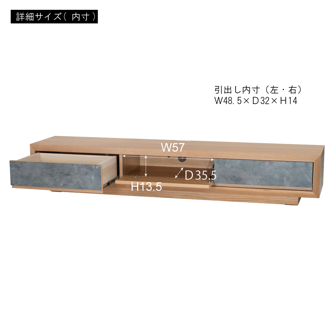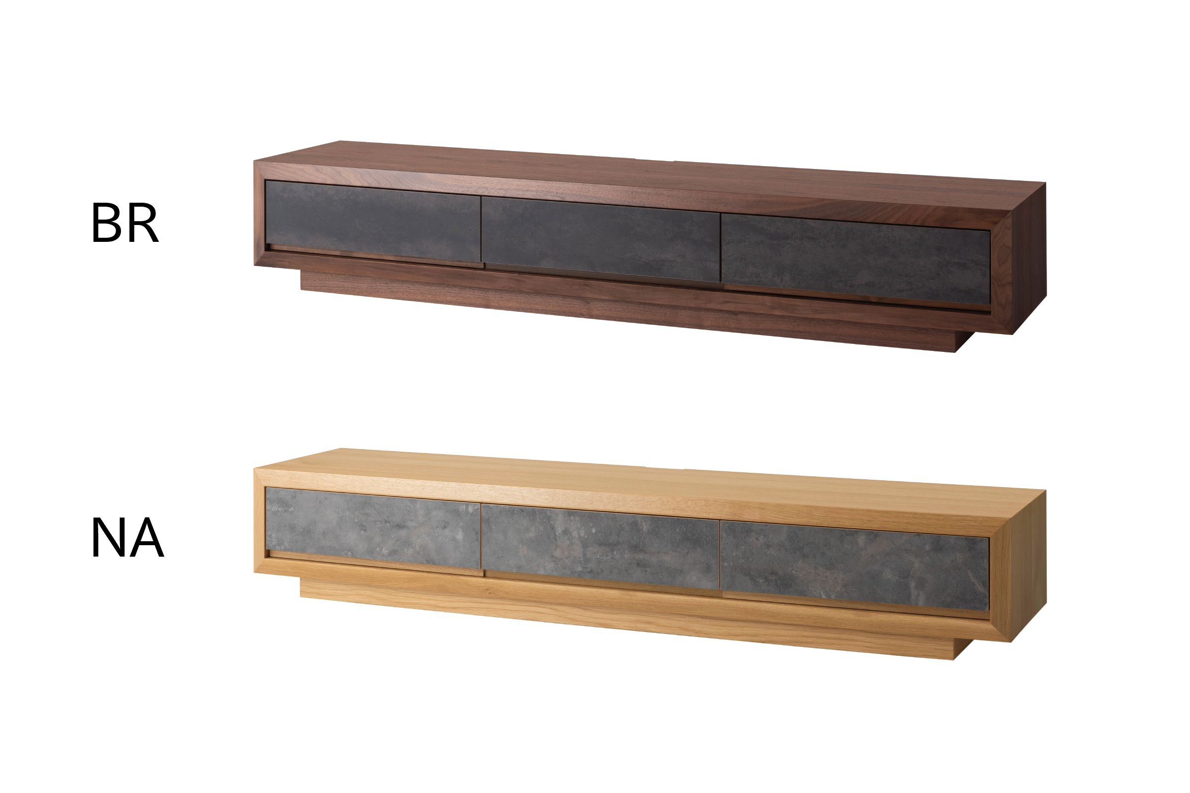 天然木の木目を活かした本体の側面に、石目調のデザインを施したローボード。