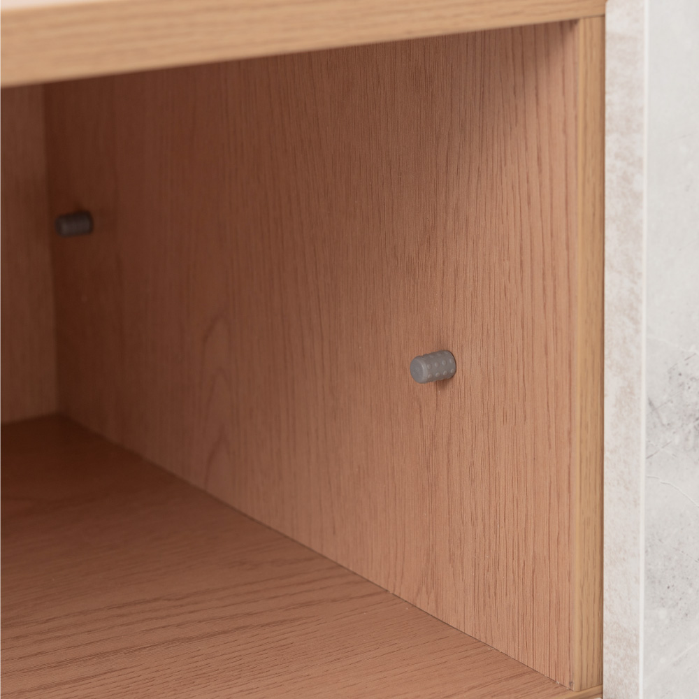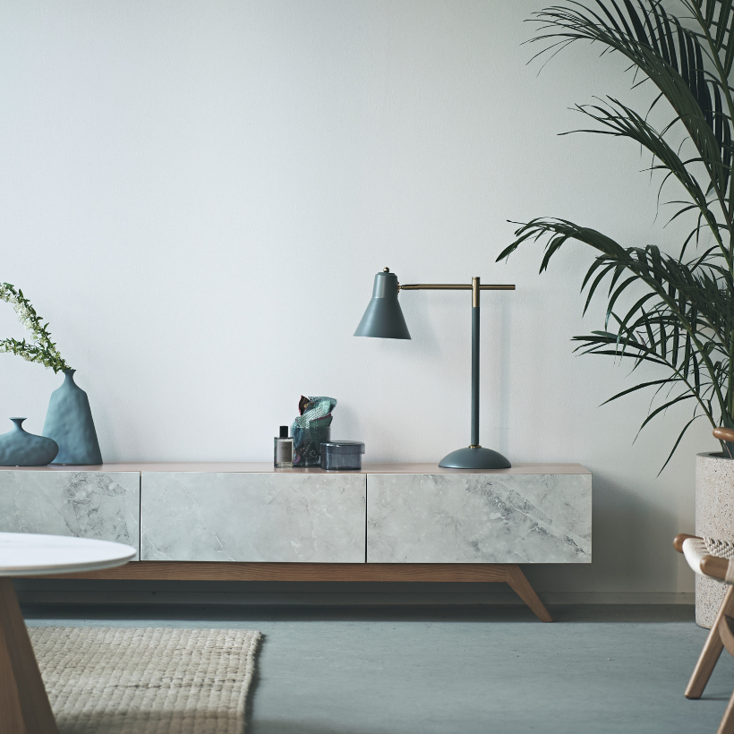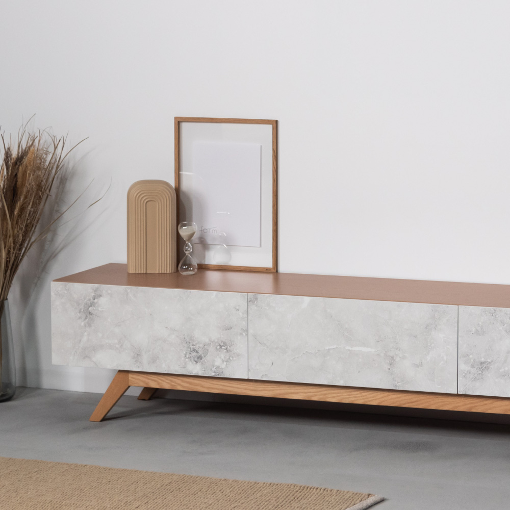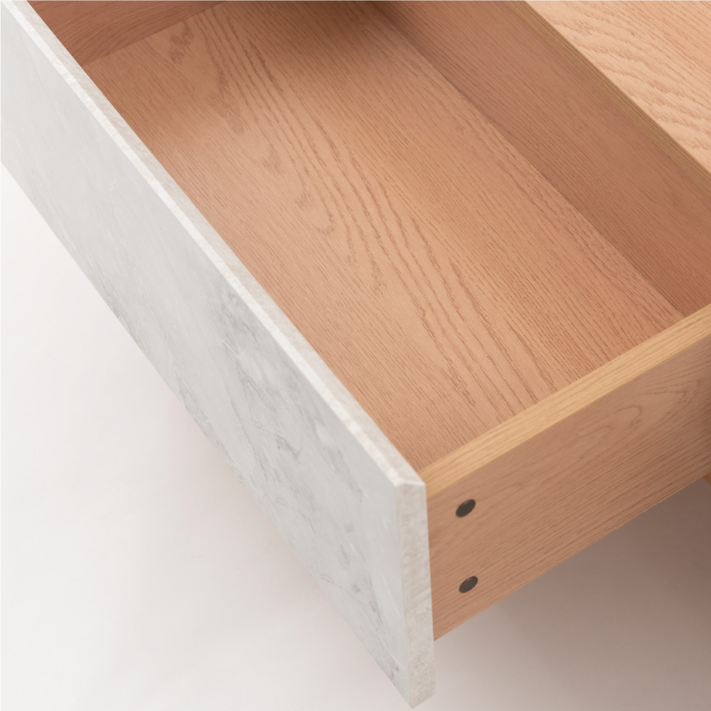 直線的なフォルムの本体に大理石調の前板を施し、脚部には天然木のオーク材を使用しました。