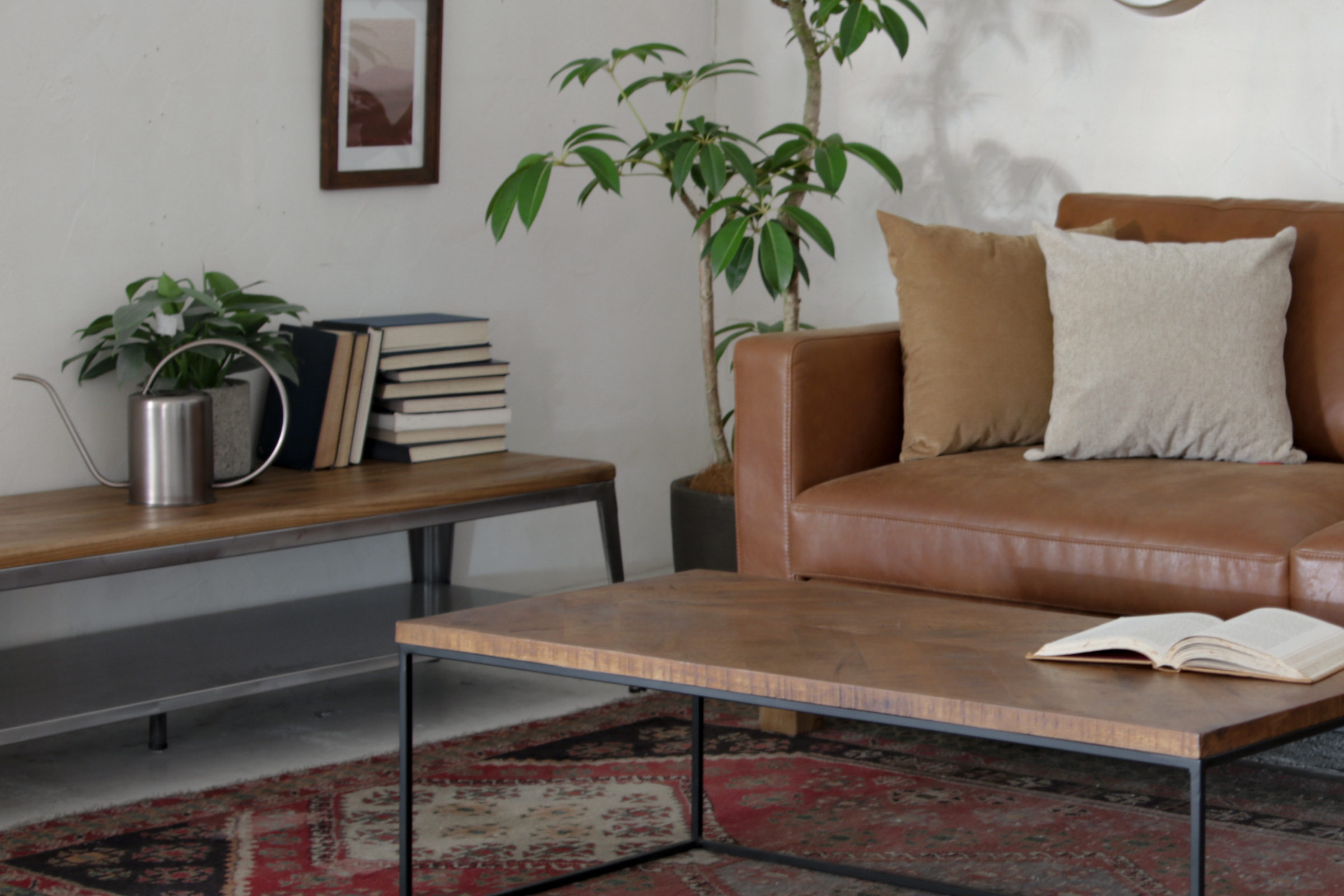 鉄の持つ質感やエルム無垢材の持つ美しい木目を活かし、極限までシンプルな構造にして、ミニマルな質感の美しさと、近年のシンプルなTVに合うバランスで仕上げたTVボード。